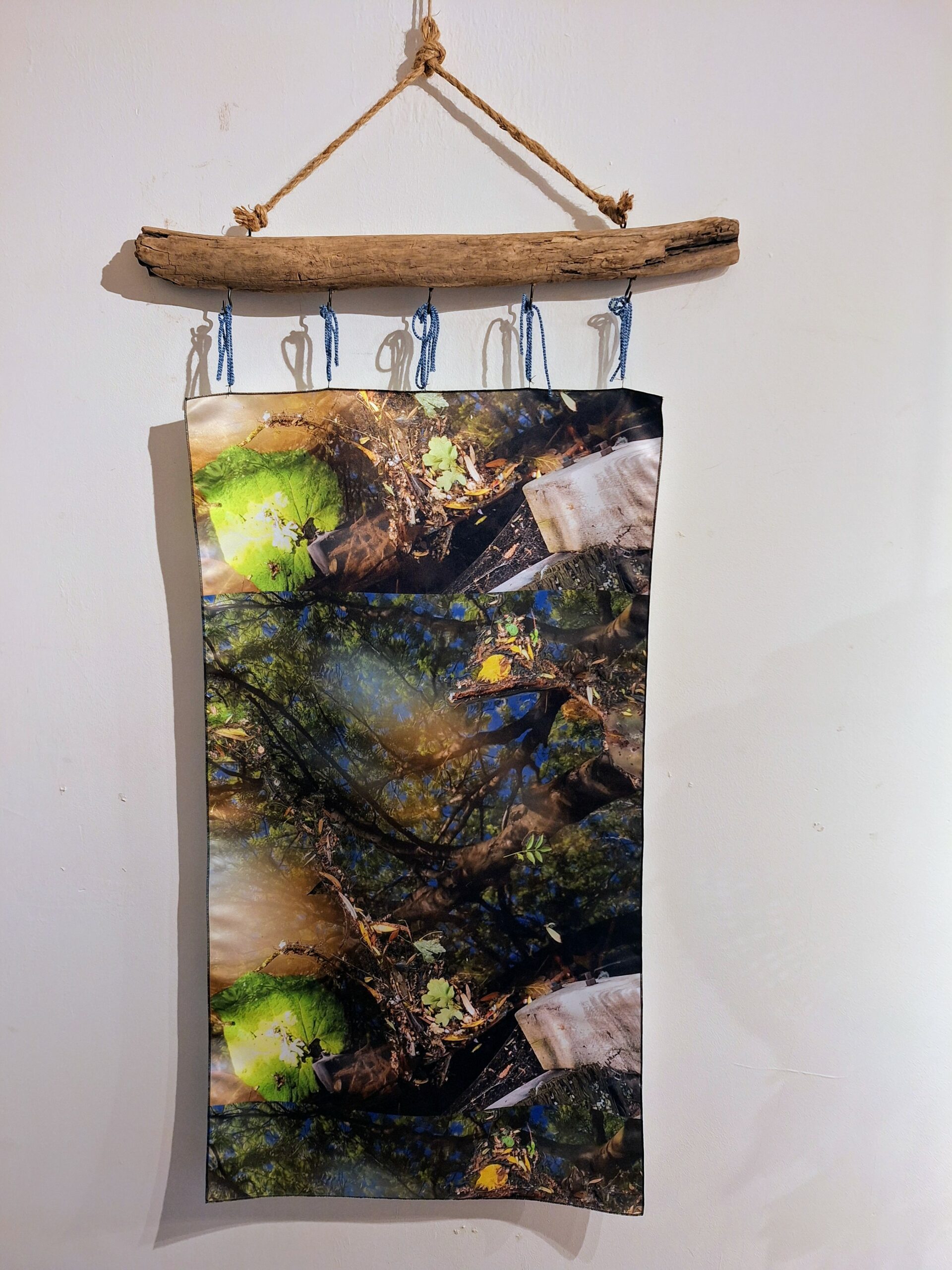 “Dream Landscape I and II”, Hanging Objects, Photography on Satin. Materials; Wood, Tree Brench, Rope, Threads, Iron, Satin. Size: 1,36 x 60 x 4 cm.