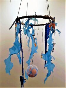 2020: ‘Dream Landscape I’ – Hanging Object Materials: Wood, Rope, Threads, Iron, Photography on Satin. Year of made: 2020 as one on the pieces for the exhibition ‘The New World’ – Museum M.A.C. House Leusden 2020. Total dimensions: 1.36 m. x 60 x 4 cm., 2020.