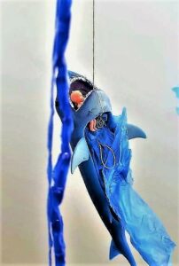 ‘Chewing FUN’ installation refers to the fact that stuff mostly found in all waters are nets, ropes and throw away plastic packages of food and drinks. In due time, these packages fall apart and change into micro plastic, which finally becomes plastic soup. In the end all this material forms part of the food chain; fishes and other sea animals eat throw away materials and plastic, humans are consuming same animals, so eventually, humans are eating their own ´plastic soup’.